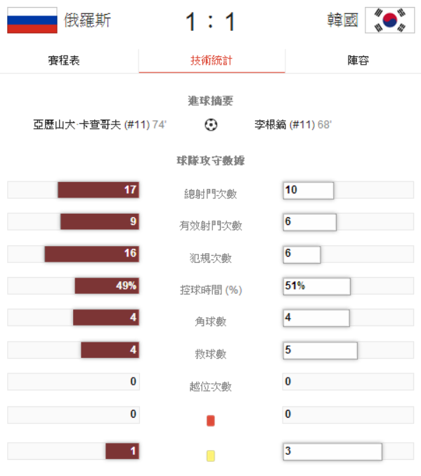 在H組的第二場比賽,是由俄羅斯對上韓國,比賽時間為台灣時間06:00,最後比分為1:1,和局收場。