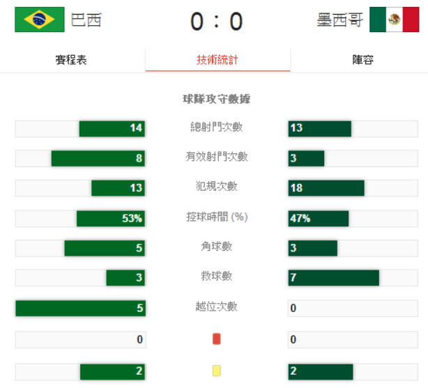 在A組第三場比賽,也是各隊開展開第二輪比賽,這場球由巴西對上墨西哥,必賽時間為台北時間6/18 03:00,最後比數為0:0,和局收場。