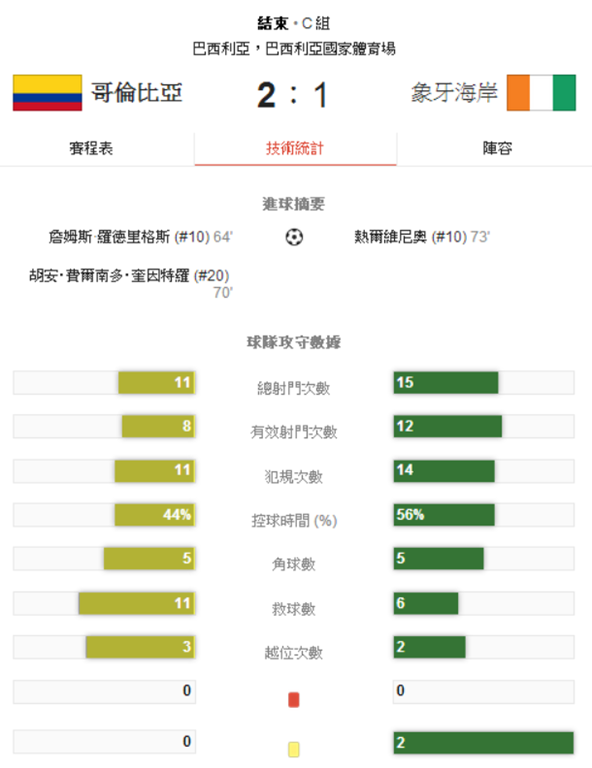 2014 世界盃足球賽 哥倫比亞 對 象牙海岸 賽事結果 G21