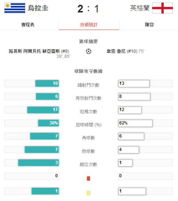 球賽一開始,烏拉圭球員路易斯·阿爾貝托·蘇亞雷斯接獲隊友的吊中球,頭頂破網(39′),拿下第一球。烏拉圭以一分領先直到下半場,而英格蘭主將魯尼在第75分鐘時,也是依靠吊中球射進他本屆世界盃的第一球。但在第85分鐘時,先前已經踢下一分的烏拉圭球員路易斯·阿爾貝托·蘇亞雷斯,接獲由中場的長傳,突破後衛與守門員踢進致勝的一球,烏拉圭最終就以2:1擊敗英格蘭,保有晉級的機會,而吞下兩敗英格蘭,在下場比賽結束後,只能在觀眾席上或是電視機前繼續參加這次世界盃。本場賽事的精彩畫面可參考FIFA官網:http://www.fifa.com/worldcup/videos/highlights/match=300186486/index.html。