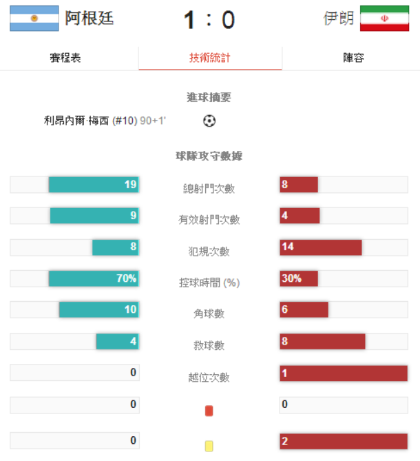 阿根廷在這場比賽中,掌握了大部分的攻勢,有效射門次數很多,射門時機也非常好,但可惜在角度上都差了一點。而伊朗其實也也很多很棒的射門,但整場球也都沒有射進。