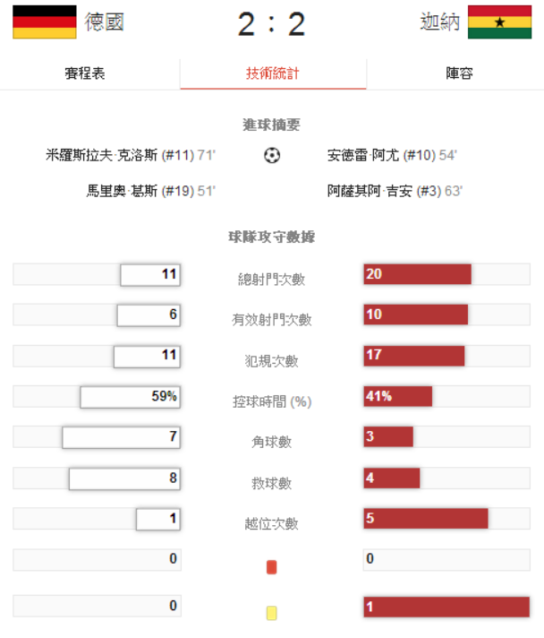 2014 世界盃足球賽第29場賽事,由G組的德國 對 迦納,比賽時間為台灣時間6/22 03:00,最終結果以2:2平手。