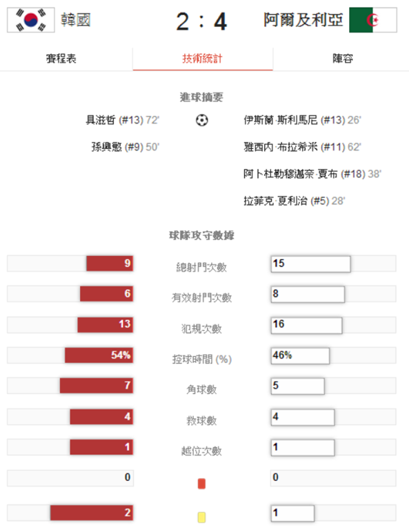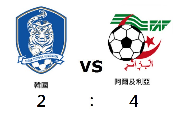 2014 世界盃足球賽第32場賽事,由H組的韓國 對 阿爾及利亞,比賽時間為台灣時間6/23 03:00。最終比數為2:4,阿爾及利亞獲勝。