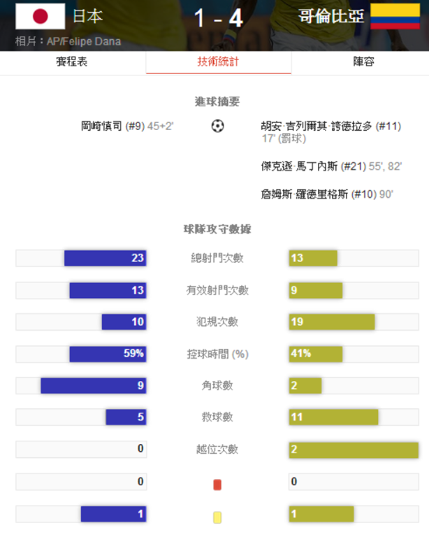 2014 世界盃足球賽第37場賽事,由C組的日本 對 哥倫比亞,比賽時間為台灣時間6/25 04:00,最終比賽結果1:4 哥倫比亞勝。