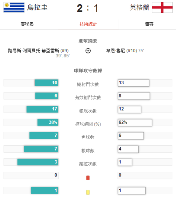 賽事 23結果 烏拉圭 對 英格蘭 2:1 烏拉圭獲勝