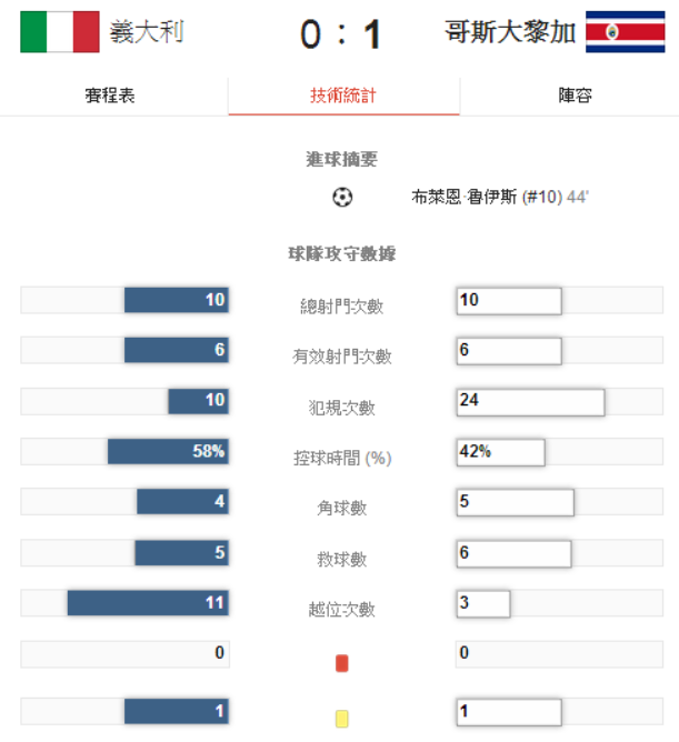 賽事 24結果 義大利 對 哥斯大黎加 0:1 哥斯大黎加獲勝