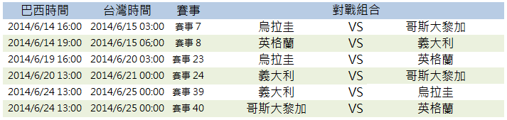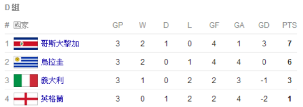 2014 世界盃足球賽 FIFA 最新D組賽程、比賽結果與各隊介紹- 烏拉圭、哥斯大黎加、英格蘭、義大利 Final