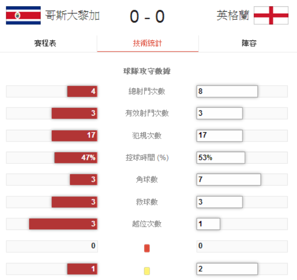 賽事 40結果 哥斯大黎加 對 英格蘭 0:0 和局