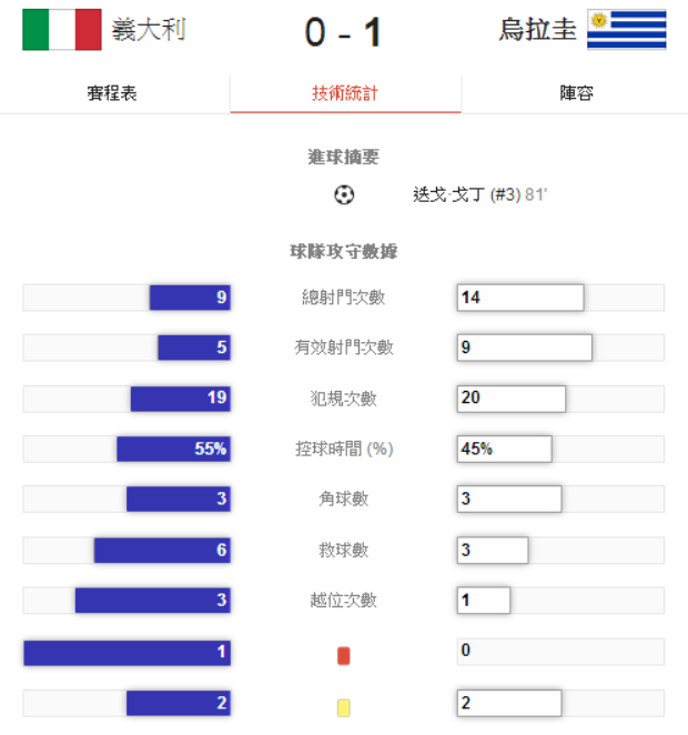 賽事 39結果 義大利 對 烏拉圭 0:1 烏拉圭獲勝