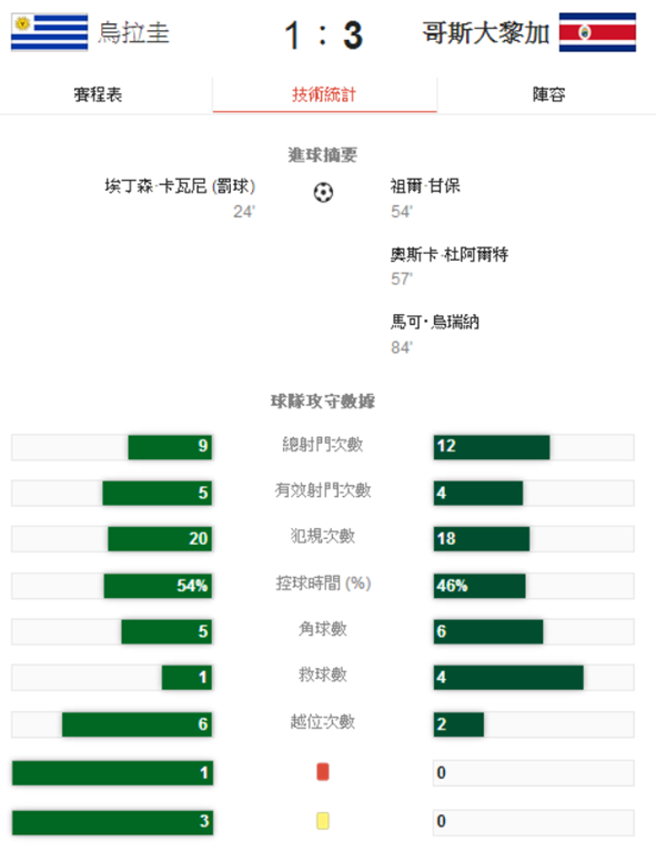 賽事 07結果 烏拉圭 對 哥斯大黎加 1:3 哥斯大黎加獲勝