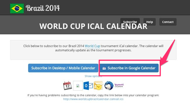 不過目前內建的足球中還沒有更新到 2014 World Cup 的行事曆,但是也沒有關係,我們可以從 “http://www.worldcupbrazilcalendar.com” 所為我們製作的世界盃行事曆中來訂閱匯入。