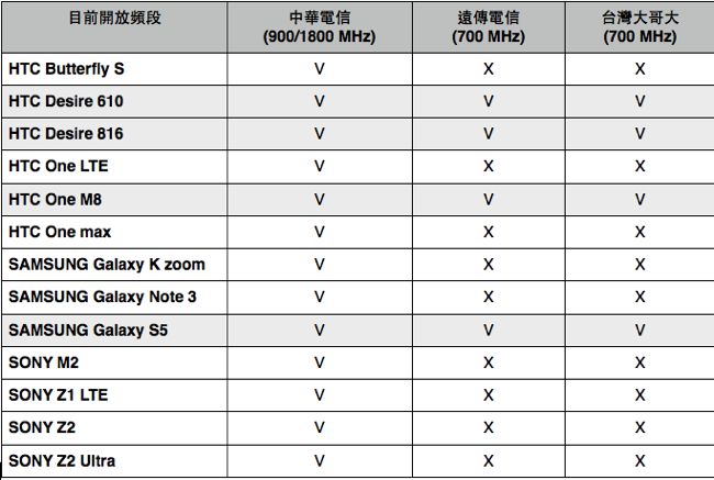 從表格中可以清楚看出目前市面上同時支援三家電信業者 4G 的手機共有四隻,分別是 HTC Desire 610/ HTC Desire 816/ HTC one M8 與 SAMSUNG Galaxy S5 。