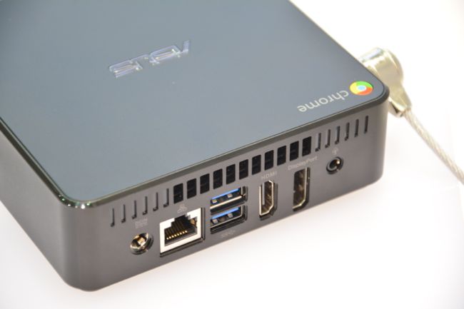 這個 Chromebox 有著 12.4cm x 12.4cm x 4.2cm 正方形的大小,Intel Celeron 2955U 或是 Core i3-4010 處理器,16GB ROM。在背後配置著 HDMI、顯示器、網路線與 4 個 USB 3.0 的孔位。