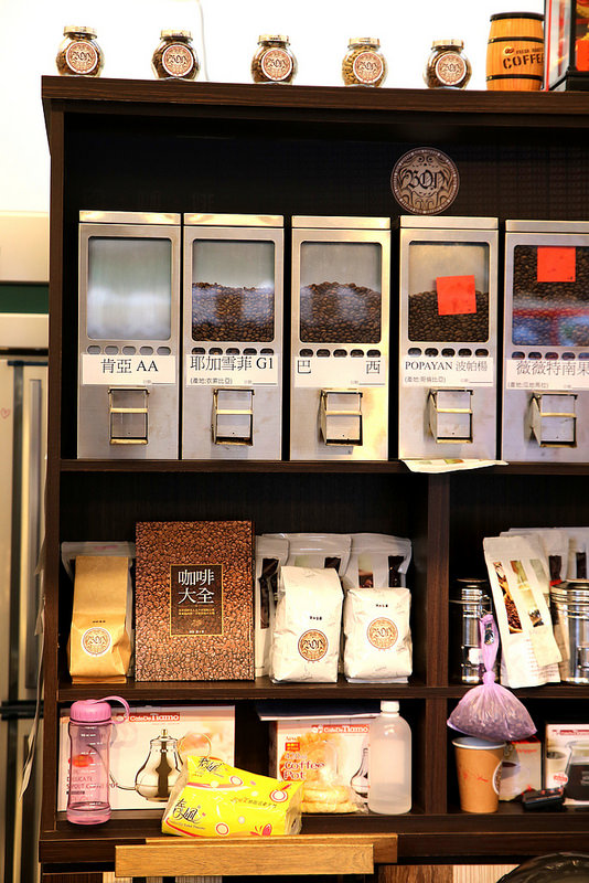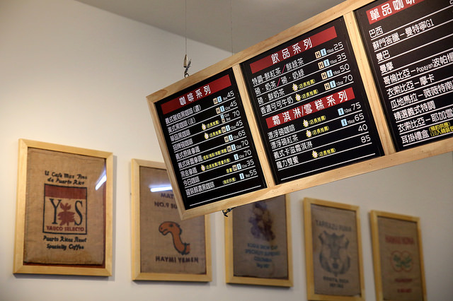 很平實的價格,單杯45~70元,半磅咖啡豆220~320元,咖啡豆的品項也走向大眾化路線,哥.巴.曼.摩.加上瓜地馬拉、耶加雪菲,牆上掛著些已經裝框的五公斤生豆麻布袋。