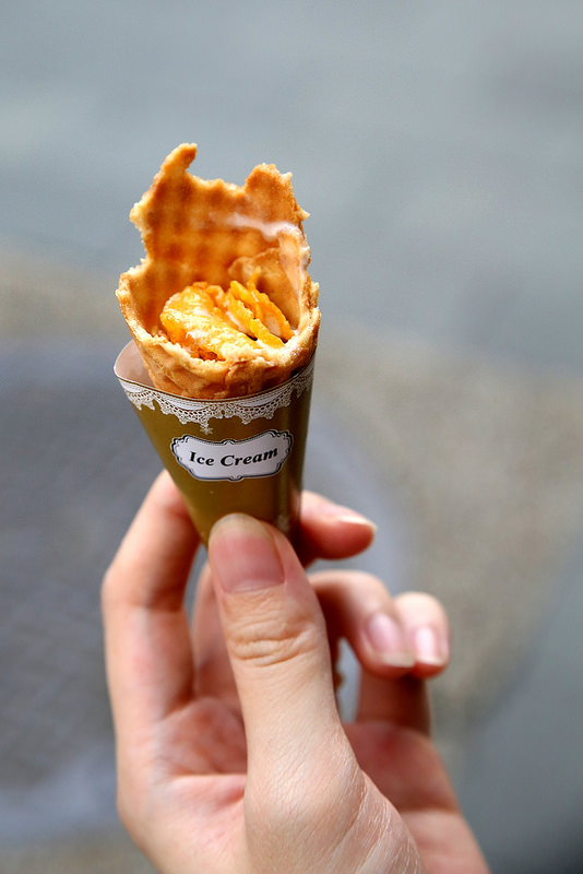 邊走邊走,整個黑糖霜淇淋一下子就被我們吃完了,沒想到驚喜在最下面啊!最下面竟然還放了些玉米穀片,脆脆的鹹香搭配霜淇淋超對味的~