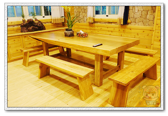 小米今天住的正是這棟新木屋,整棟都是使用原木香杉建材,大廳非常舒適,有兩張大桌子,能容納二十人聚會聊聊天撮撮有餘。