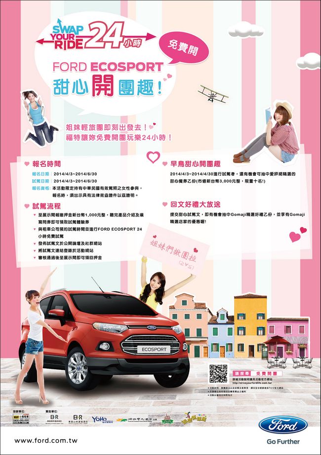 因為Ford EcoSport具備的靈巧車身設計和絕佳的穩定及操控性,適合女性駕乘者更輕鬆、自信穿梭街角巷弄間,Ford汽車特別為女性駕駛者規劃了姊妹專屬的「Ford EcoSport 甜心開團趣」24小時免費試駕活動,活動自4月3日開跑後反應熱烈,迅速擄獲女性用車者肯定EcoSport於駕馭、機能、科技與安全等面向領導市場的出色定位,更讓車系銷售數字衝向新高。「Ford EcoSport 甜心開團趣」活動即將於6月30日劃下句點,想免費體驗EcoSport都會輕休旅魅力的姊妹們,絕對要手腳加快,把握此試駕機會。