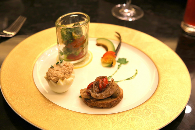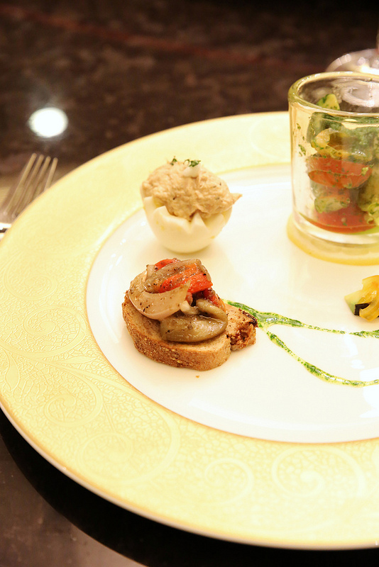 第一道是個表現不錯的前菜冷盤,我喜歡它錯落有致的擺盤方式,玻璃盅裡是浸過橄欖油的蔬菜,另外在雞蛋上的是鮪魚沙拉,還有酪梨片跟麵包佐油漬辣椒洋蔥。