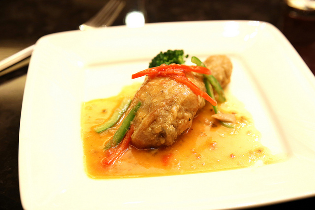 接著上的是,一刀下去就瞬間骨肉分離的紅酒燉雞腿肉,主廚說這是西班牙家常料理,耐燉的雞腿肉事先煎過,再以常用的蒜頭、洋蔥、青紅椒來提味,味道很清爽,雞肉超軟嫩。