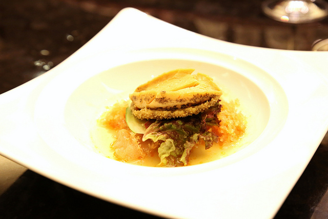 撈汁鮑魚拌蜇頭,由於北京不靠海,所以是來自大連的鮑魚,用香油、醋、辣椒、芥末調味,肉質肥厚沒話說,也不會有讓你咬不斷的尷尬,辣椒的辣、芥末的嗆,一下子就讓你的味蕾醒了過來。還有這香油,主廚說北京菜都會用這來提個味。