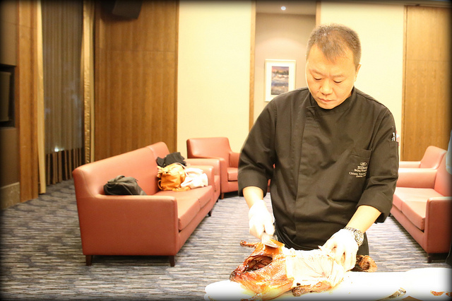品嚐完西班牙北中南部家常料理後,登場的就是說著一口京片子的北京王府井希爾頓飯店姜健主廚,由於不必透過翻譯,所以聽他講起北京菜的各種做法,特別的過癮。比如他說,這北京料理經常用到的「爆」這個手法,就有水爆、火爆、醬爆、油爆、蔥爆、湯爆等等。