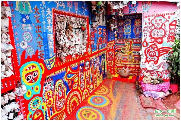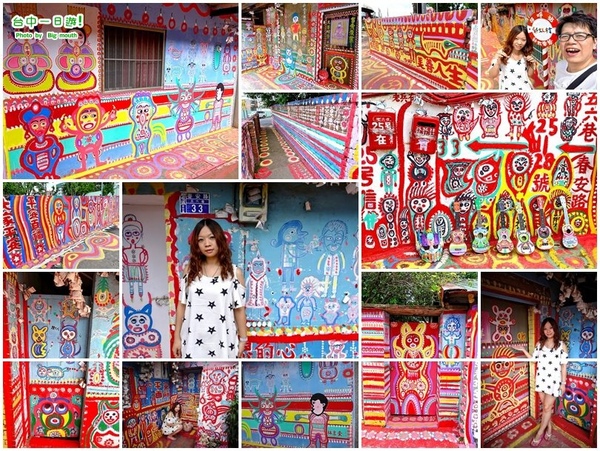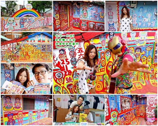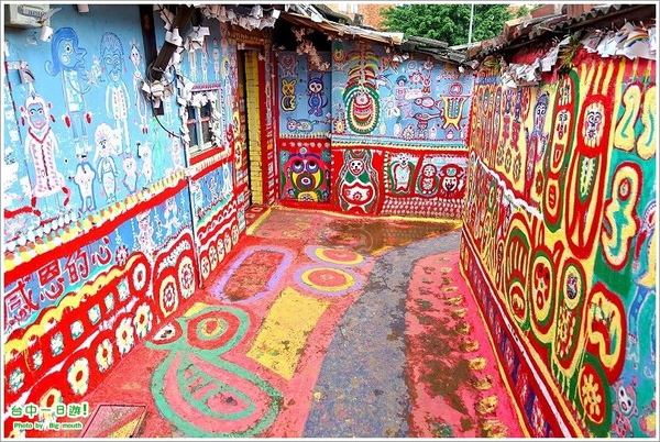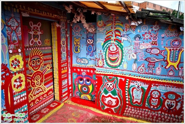 ▼ 「彩虹眷村」位於台中市南屯區春安路56巷,鄰近嶺東科技大學,長達五十公尺的巷弄裡,處處充滿各式彩繪的人物、動物、小鳥、水牛、彩虹及祝福的話語,這 些鮮豔的彩繪皆出於黃永阜老爺爺之手,民國97年8月老爺爺突發奇想,用水泥漆將地面塗成繽紛的彩虹,想到什麼就畫什麼,意外獲得大家喜愛,越畫越起勁, 成了這麼一個美麗的彩繪天堂。