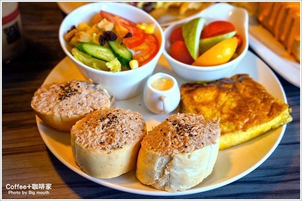 ▼「法式鮪魚餐」,內容有法式鮪魚厚片土司+蔬食沙拉+西班牙烘蛋+季節水果,蔬果份量不少,搭配鮪魚跟烘蛋感覺吃了會頭好壯壯;法式鮪魚吃起來相當爽口,麵包也有點咬勁,吃起來美味Q彈。