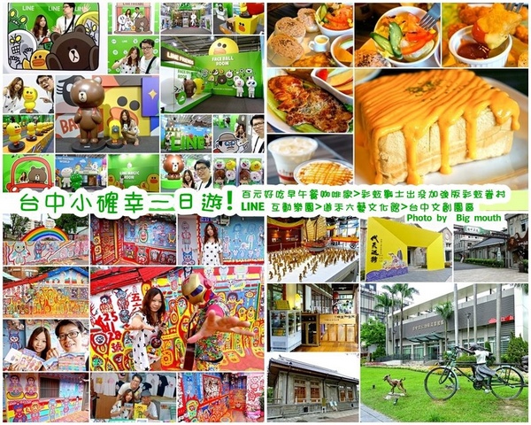 這次大口又要帶大家來去台中小確幸一日遊溜!台中是個人文氣息濃厚的城市,非常適合像大口這種現代文青來去玩耍啊(推推眼鏡)!玩耍之前一定要睡飽飽跟吃飽飽,首先先帶大家吃個百元好吃的澎湃早午餐「咖啡家Coffee+」,大份量的美味餐點搭配特調拿鐵整個就是絕配啊!吃飽喝足後,再帶大家來去有彩虹戰士出沒的「彩虹眷村」,滿滿的彩繪牆面跟互動拍照的彩虹戰士,整個就超適合狂拍照搭!接下來再帶大家來去熱情的「LINE FRIENDD互動樂園」吹冷氣逛展覽,超過40隻等比的LINE主角公仔在那跟大家招招手,等我們去玩耍兒!逛完展覽後,再來去戶外的「道禾六藝文化館」及「台中文化創意產業園區」走走晃晃,這是文青必去的拍照景點啊!準備好了嗎?快跟大口一起出發溜!
