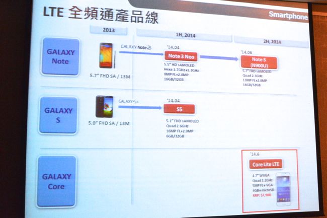 在記者會中除了可以看見早上才發出新聞稿宣布上市的中階全頻手機 GALAXY Core Lite。