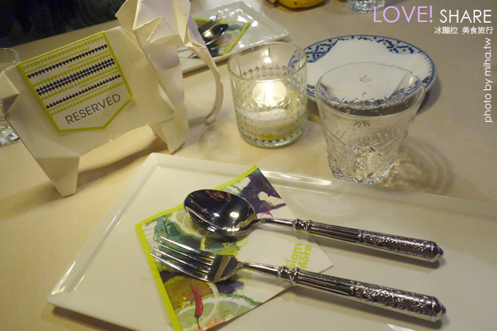 因為選了套餐,不用三分鐘挑選個飲料就點好菜,這時候看到桌上的餐具跟蠟燭,眼睛又發光,這餐具好美啊~說真的很多台灣的泰式料理沒有非常用心或想簡單了事,很多餐具這時候就露出馬腳,筷子超像自助餐店的,氣氛大打折扣,但饗泰多的餐具實在好美,上頭的雕花很精緻喔!連底下墊的紙巾都有特別挑過,我們每個人都很喜歡這特殊的設計紙巾。