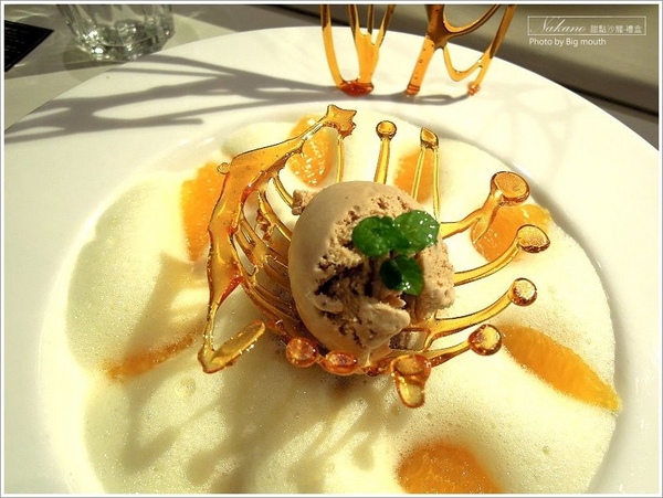 ▼朋友點的「柑橘修可拉佐白酒沙巴庸」,是巧克力慕斯佐西班牙白酒製成的沙巴庸蛋酒醬汁,一旁也有糖工藝裝飾著,一上桌大家驚呼連連。