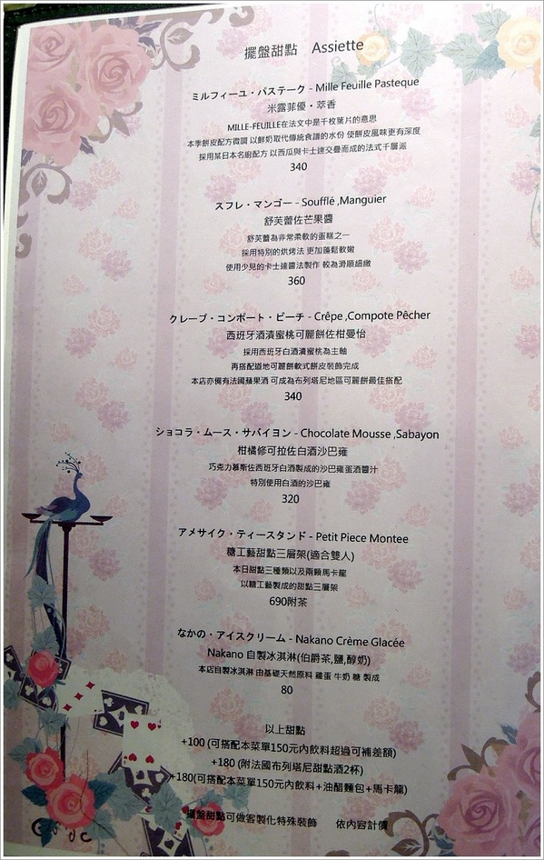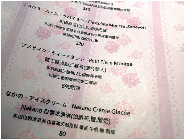▼接下來就趕緊來看看他們的menu溜!他們的擺盤甜點大概價位落在300多元,甜點有部分是現點現做的,所以坐在吧台區可以清楚看到師傅做甜點的過程。
