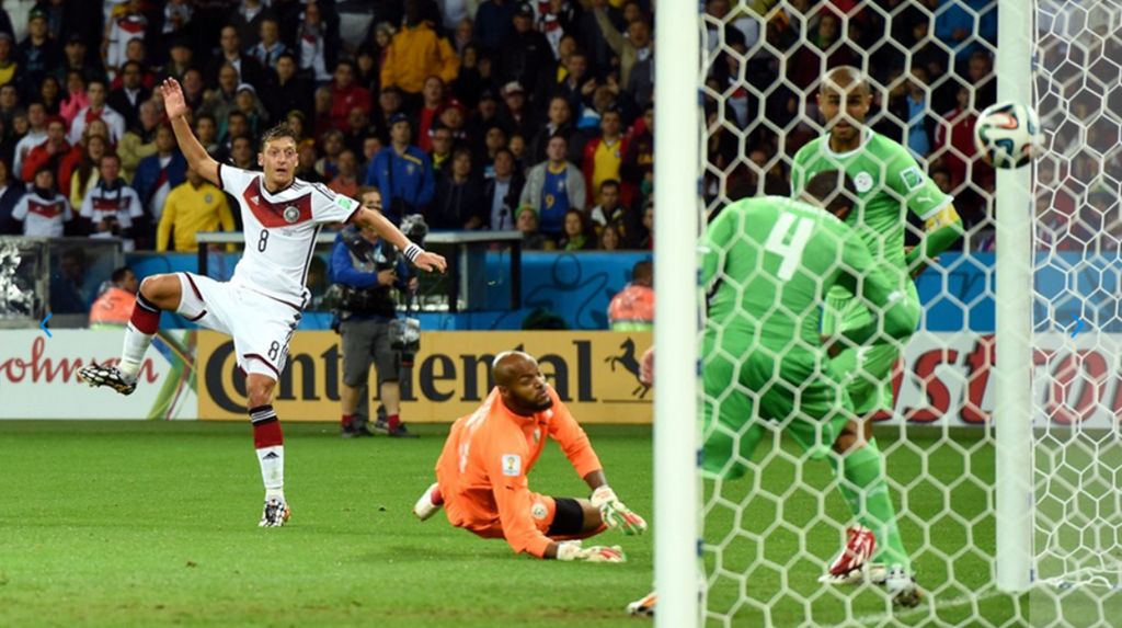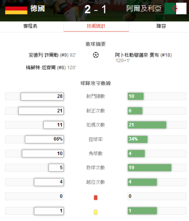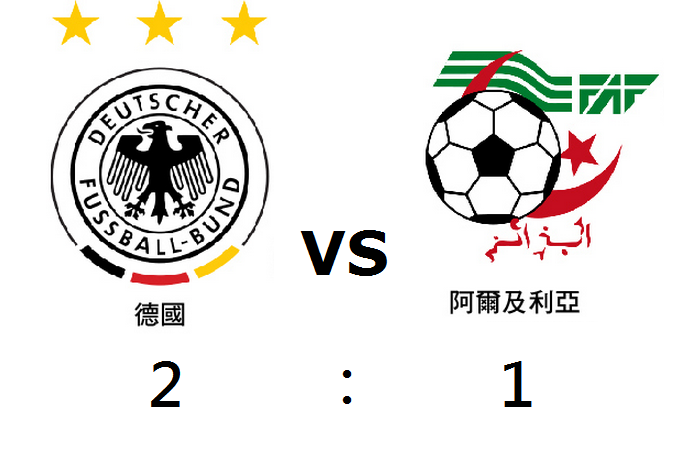 2014 FIFA 世界盃足球賽16強淘汰賽,第6場賽事由G組第一名德國,對上H組第二名阿爾及利亞,比 賽時間為台灣時間7/1 04:00。最終比賽結果,德國在延長賽時,以2:1擊敗阿爾及利亞。