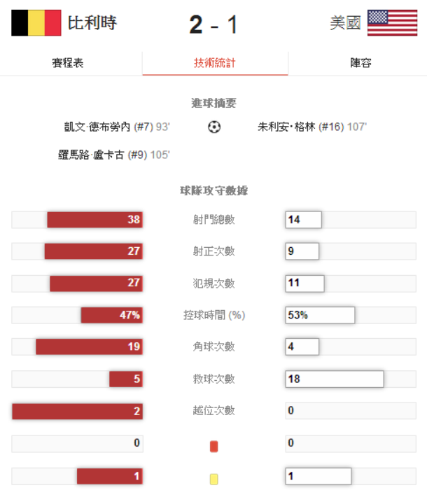 2014 世界盃足球賽 16強淘汰賽 比利時 對 美國 賽事結果