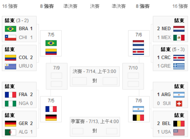 2014 FIFA 世界盃足球賽16強淘汰賽,第8場賽事由H組第一名比利時,對上G組第二名美國,比 賽時間為台灣時間7/2 04:00,最終比數為2:1,比利時獲勝。