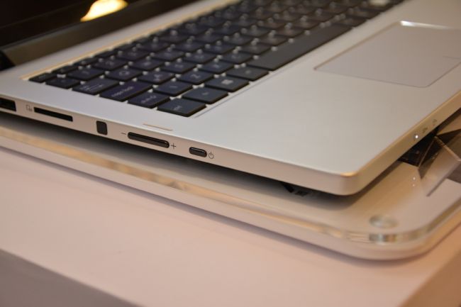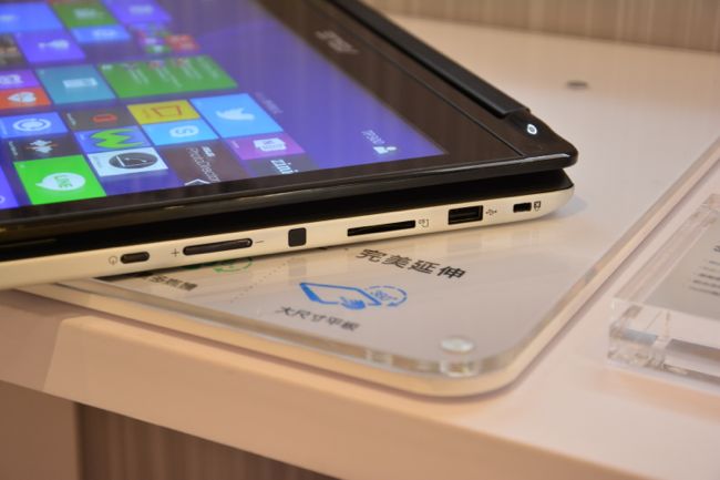 有別於一般筆電設計在鍵盤上,這次 TP300 與 TP500 兩款的都將電源設計在側身,讓使用者不論在筆電模式或是多人分享模式下都可以輕鬆的開啓電源。