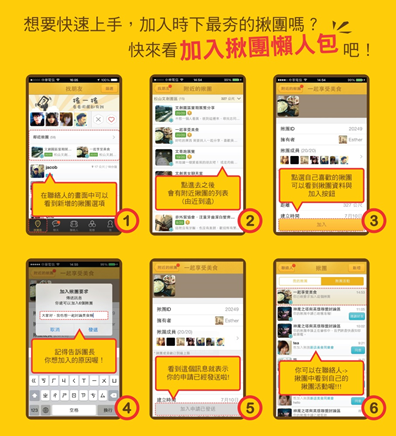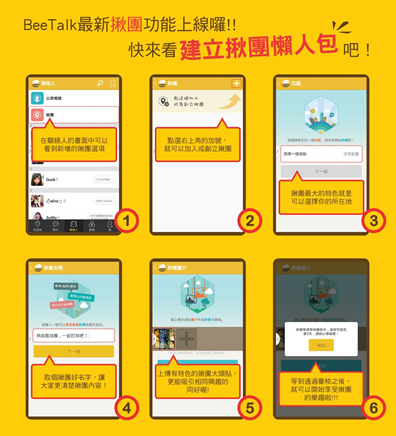 BeeTalk特別推出揪團6步驟,讓使用者更熟悉BeeTalk最新的揪團功能。首先,使用者可在找朋友列表點選「鄰近揪團」的選項,BeeTalk將會列出使用者附近所有可以加入的揪團,使用者能依照位置、揪團名稱及簡介等資料選擇加入該揪團。使用者送出加入揪團要求,入團之後即可和團內的蜂友互動。使用者亦可自行擔任主揪,取個吸引人的團名之後,上傳有特色的大頭貼,即可吸引有相同興趣的同好。