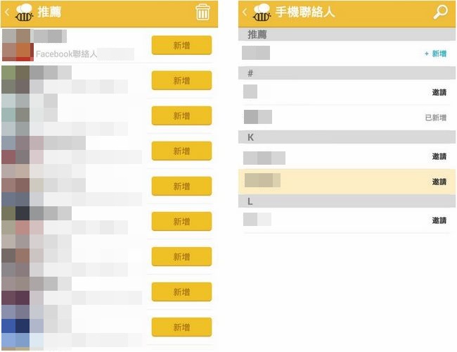 BeeTalk 可選擇同步手機通訊錄,找朋友也可由臉書聯絡人或手機聯絡人尋找,在臉書與手機的聯絡人中出現”推薦”的一個是已經在臉書與手機聯絡人中的朋友,至於手機聯絡人,可以新增或邀請他們加入。
