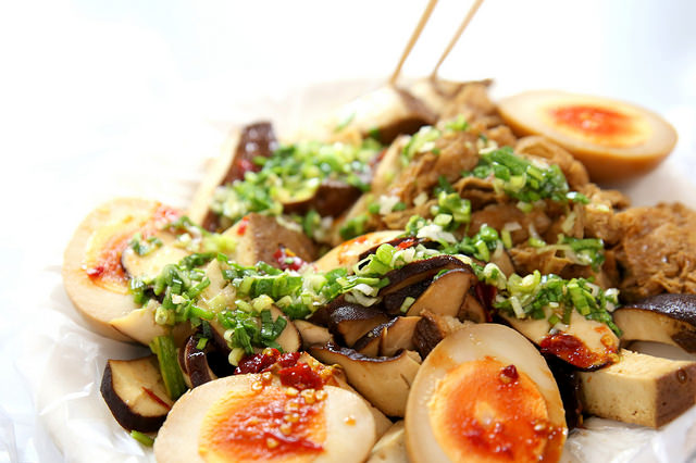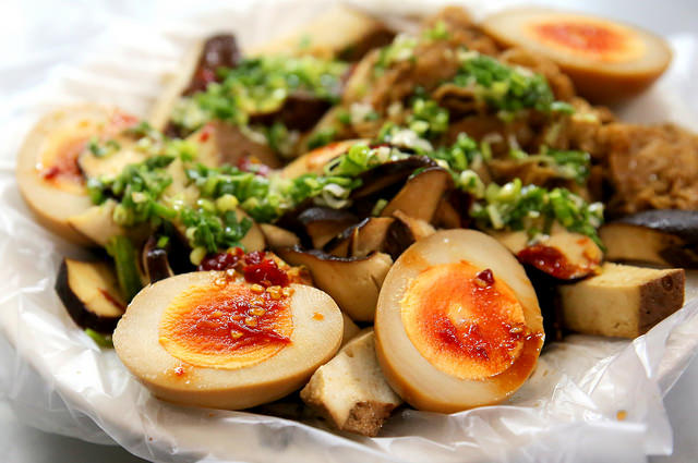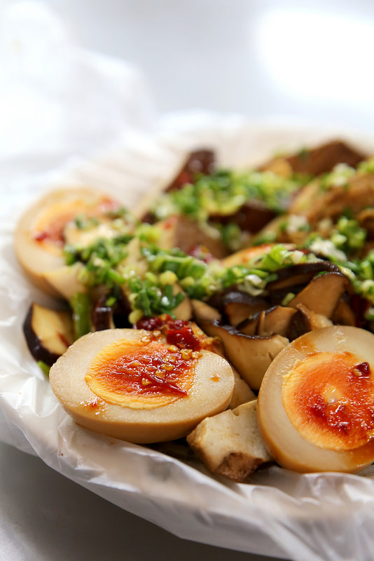 「來去吃老阿伯豆干吧!快點~」我這樣說著,一點也沒有商量的餘地。因為現在的時間已經是下午五點,中餐沒吃,得到的結果就是喪失思考能力,加上脾氣暴躁。其實從阿伯還在中正公園旁榕樹下賣豆干的時候,我們就已經吃過,談不上特別喜歡。但總覺得不吃片豆干就好像沒來過大溪,所以老街上的幾間豆干專賣店,也都輪流光顧過,會偏好老阿伯的原因,還是因為他的半熟黃金蛋。