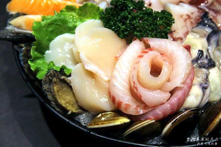 鮭魚、干貝、鮑魚、蛤蠣、小卷、海鱺、蝦子、青蚵等等豐盛海鮮