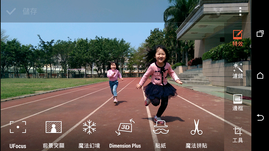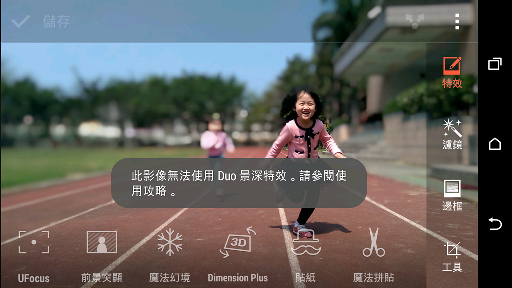 畫面底下出現了一排特效功能,都是景深相機可使用的特效,只要點下UFocus,就可進行最基本的任意選擇焦點模式。