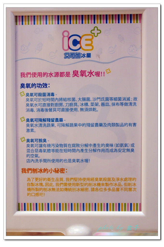 相信夏天吃冰特別是吃刨冰時總是會擔心店家用的水乾不乾淨,每年新聞也總是會報導到哪家冰品店的生菌數過高,在現在食安問題層出不窮的情況下衛生問題總是令人擔憂…而艾司加冰屋也考慮到了這一點,特別用臭氧殺菌及淨水後的水來做成製冰的水源,這讓盆子相信夏天在艾司加冰屋品嘗冰品的時候應該是可以比較安心的~