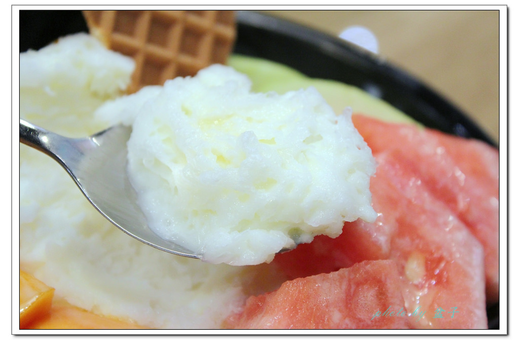 綜合水果雪花司諾的基底是馬仕卡邦牛奶口味~我真的不得不說,艾司加冰屋的牛奶雪花司諾真的可以稱得上是一絕啊~一開始盆子吃的時候還以為是因為煉乳的關係才會有那麼濃的風味,但是仔細一看,除了水果上有少許的煉乳以外冰品上面是沒有煉乳的~讓我瞬間驚豔到一個不行,沒想到她們的牛奶雪花司諾居然濃郁到會讓我有吃到煉乳的幻覺,除了香味一整個到位以外,口味上也是香濃而不甜膩,真的是一絕啊~~