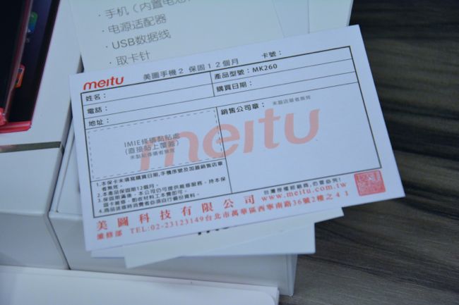 也由於這款美圖手機 2 為台灣代理商正式代理商品,因此在盒裝之中除了基本的充電器與說明書以外,還可以看見這讓人非常放心的保證卡,從保證卡上的地址更可以確認這是台灣正式引進的商品,並且享有 12個月的保固呢!