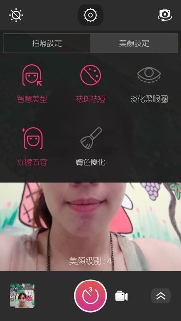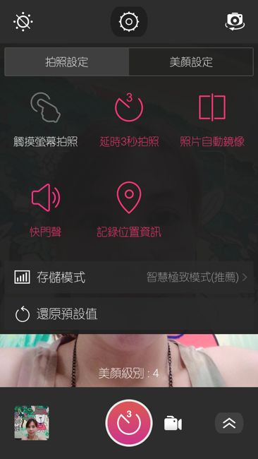 進階美肌的部分則是有著一鍵美顏與細部的消除黑眼圈、瘦臉、亮眼等等進階功能去設定微調。