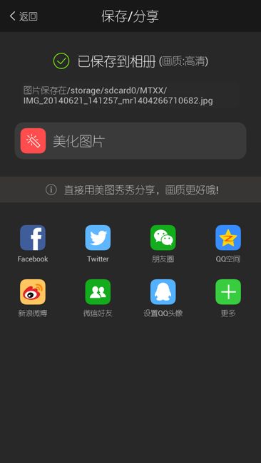 接下來,不管有沒有對照片做過後製,都能夠直接透過分享來將照片與你Facebook、Twitter、WeChat、微博等社群中的好友一同分享你今天的美麗。