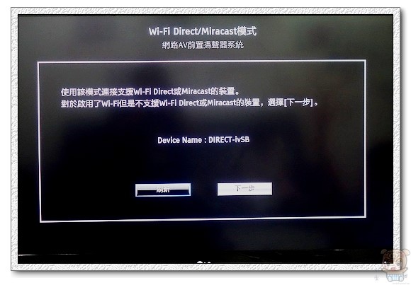 如果您所處的環境中,沒有網路的話,一樣可以透過Wi-Fi Direct或是Miracast模式,直接讓您的Android裝置與Sound Bar (SBX-N700)連線,進行無線投影。在遙控器有一個Wi-Fi Direct的專屬快速使用按鍵,按壓之後,即可進入Wi-Fi Direct或是Miracast模式。而SSID的名稱也可以透過「刷新」來進行更換。
