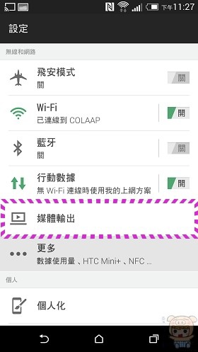 接著就是開啟您手機,例如小米使用HTC M8來測試,只要點選進入「設定」「媒體輸出」後,就可以在媒體輸出偵側到。點選「DIRECT-T8SB」,接著神奇的事就發生了XD,您手機上的畫面就熊熊的出現在電視上了。Miracast的功能實在是好用,輕鬆的就將畫面無線投影上去了。