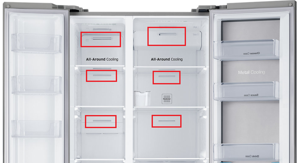 在冰箱的所有層架溫差部分,根據三星內部自行量測結果,僅有攝氏0.3的溫差,而其他部分品牌冰箱溫差部分可能都超過1度以上,這對於儲存食物上可更靈活應用,不必擔心哪一層的溫度高,不適合擺放食物。能讓每一層溫度非常平均的關鍵,除了在每一層都有出風口,來以環繞式氣流確保均溫外,還有強大的不鏽鋼鎖冷門。
