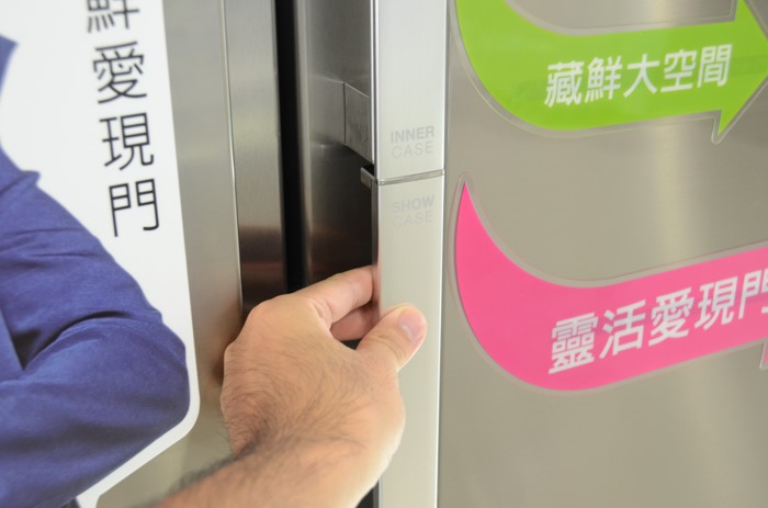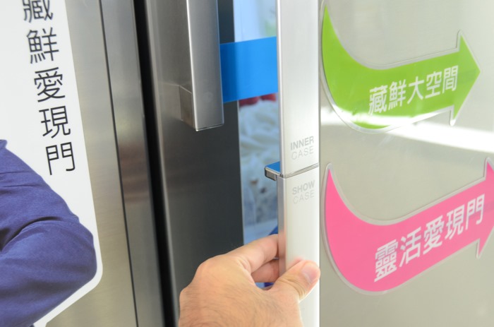 冰箱的把手分為兩部分,拉開底下的SHOW CASE門把,就是開啟靈活愛現門,拉開上方INNER CASE門把,就是開啟藏鮮大空間。